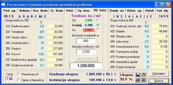 Prva slika - "Proračunska vrijednost prosječno opremljene građevine": (3) Odabrani su "Srednji troškovi" 3.200 kn/m2 x 400 m2 = 1.280.000 kn (1) |