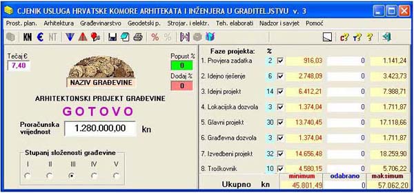 2. Postoji računalni "program za izračun cijena usluga HKA", kojeg možete preuzeti na: http://www.arhitekti-hkaig.com/akti-pravilnik-cijene.aspx u prilogu su i prateći pravilnici. Taj program je izrađen 2005. godine pa nije usklađen sa važećim Zakonom o prostornom uređenju i gradnji (NN 76/2007). Međutim, iako su faze projektiranja promijenile svoje ime, ukupni opseg posla je ostao isti.