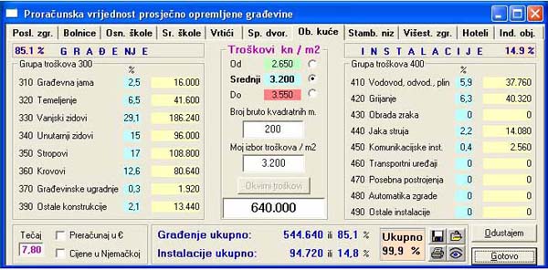 Prva slika - "Proračunska vrijednost prosječno opremljene građevine": Odabrani su "Srednji troškovi" 3.200 kn/m2 x 200 m2 = 640.000 kn |